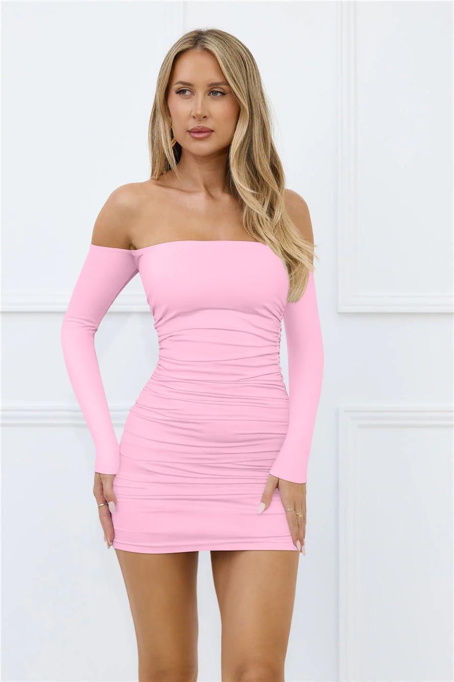 OQQ Cocktail Dresses 2025 Tube Off Shoulder Long Sleeve Sexy Bodycon Ruched Party Short Mini Dresses (Pink Cherry Blossom)