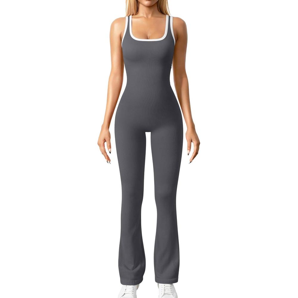 OQQ Women Jumpsuits Sleeveless Square Neck Stretch Contrast Workout Active Flared Bottoms Tank Jumpsuit(Darkgrey)
