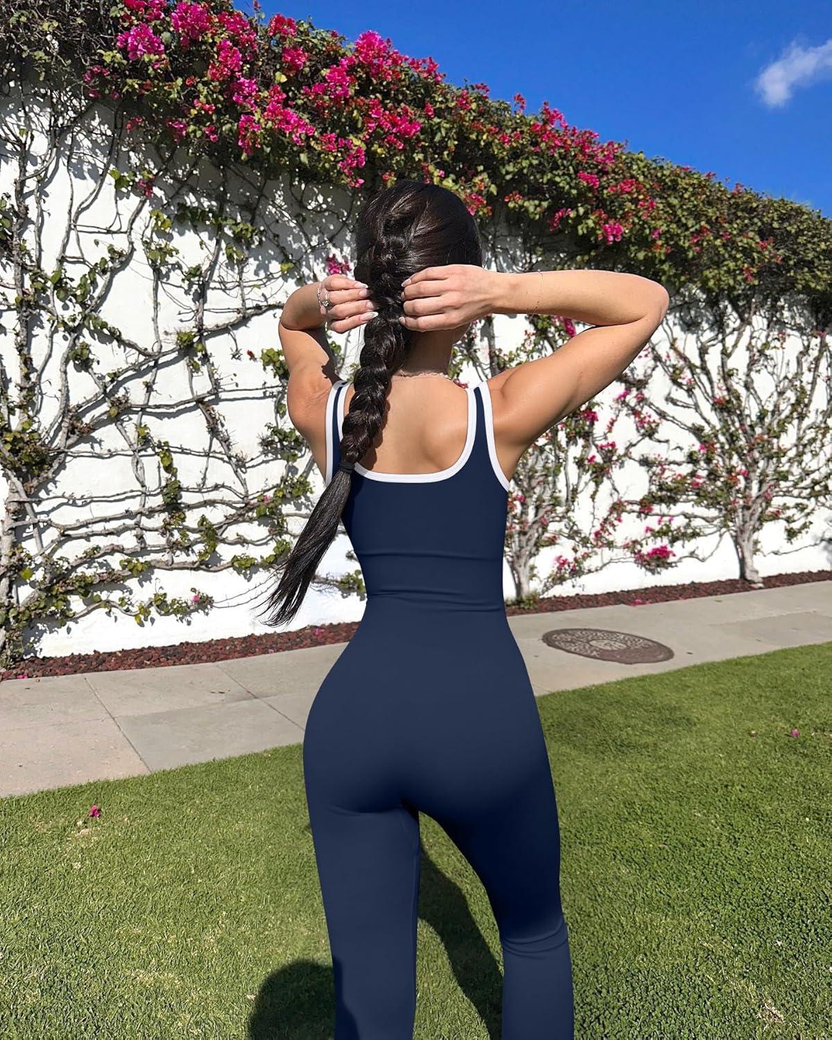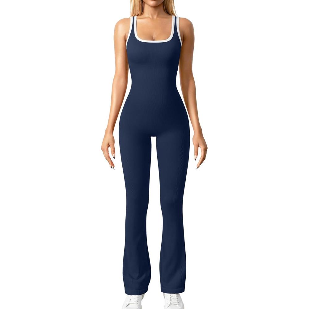 OQQ Women Jumpsuits Sleeveless Square Neck Stretch Contrast Workout Active Flared Bottoms Tank Jumpsuit(Navy Blue)