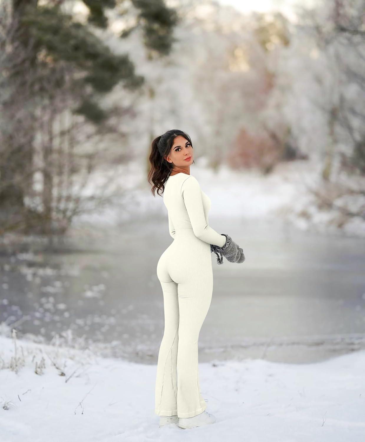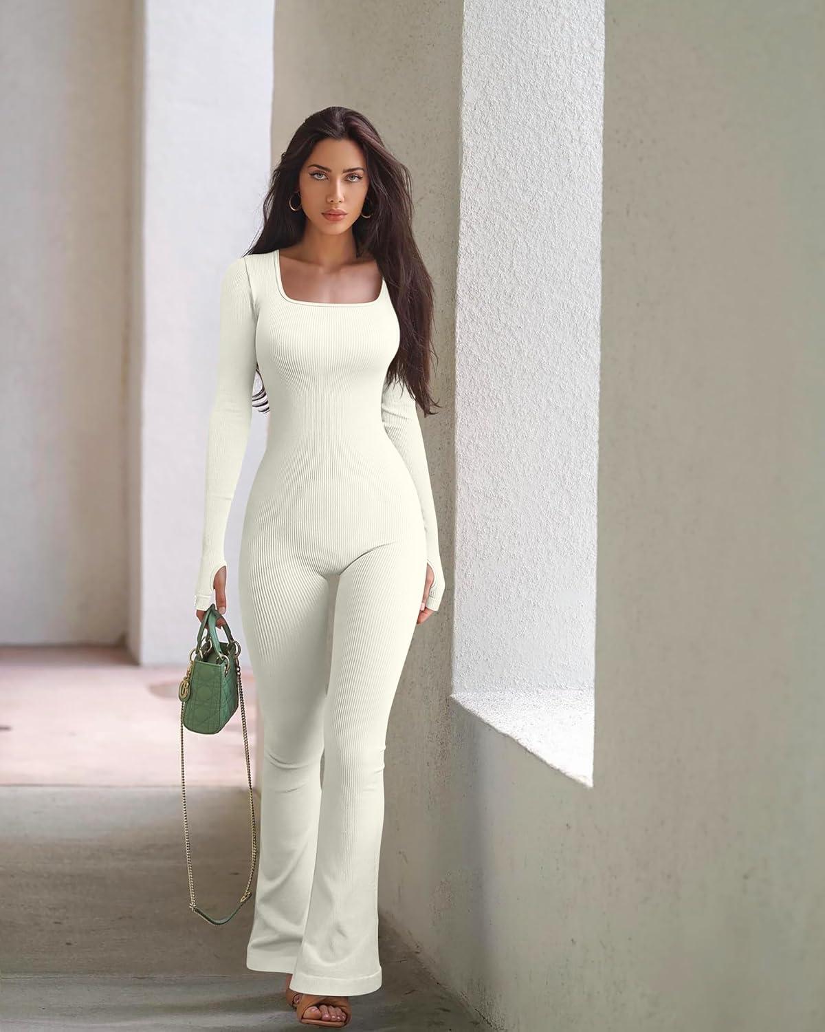OQQ Women Yoga Jumpsuits Ribbed Exercise Long Sleeve Tops Bell Bottoms Flare Jumpsuits(Beige)