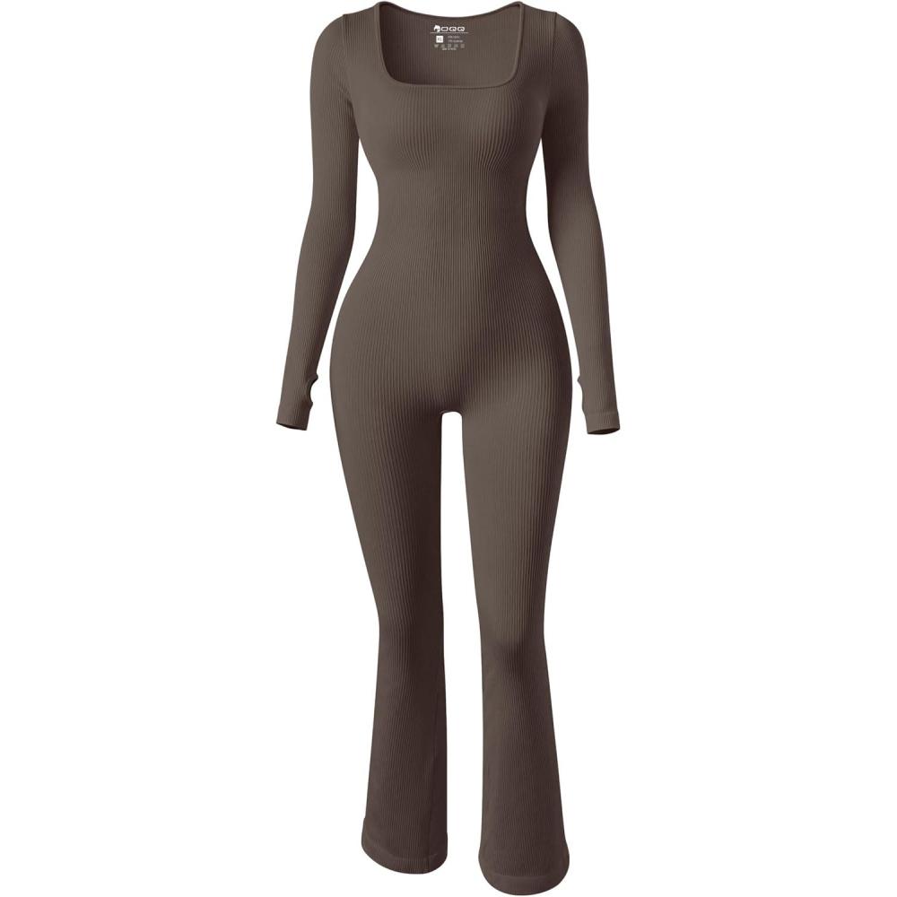 imageOQQ Women Yoga Jumpsuits Ribbed Exercise Long Sleeve Tops Bell Bottoms Flare JumpsuitsTea Leaf