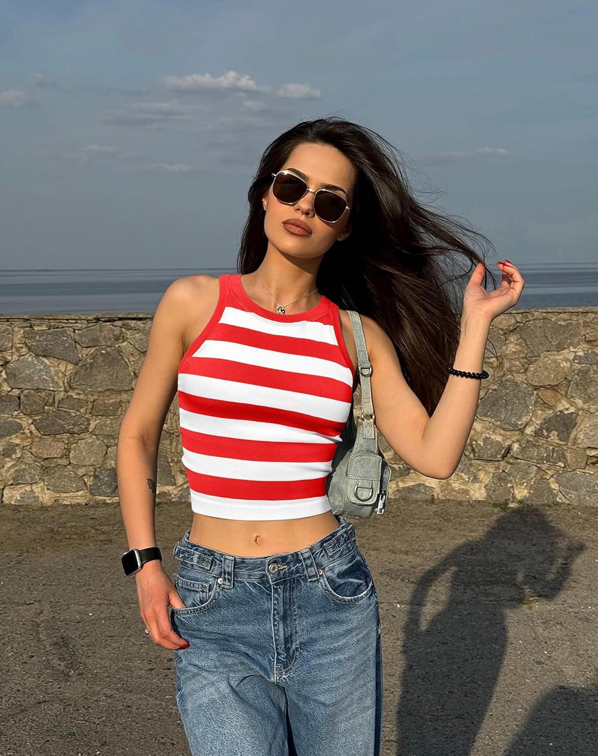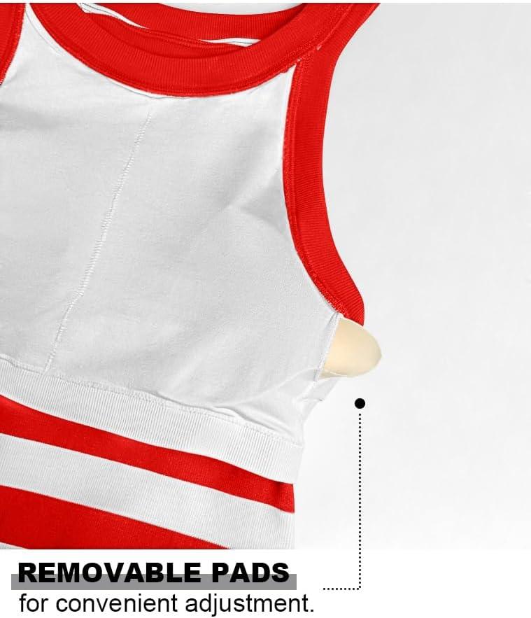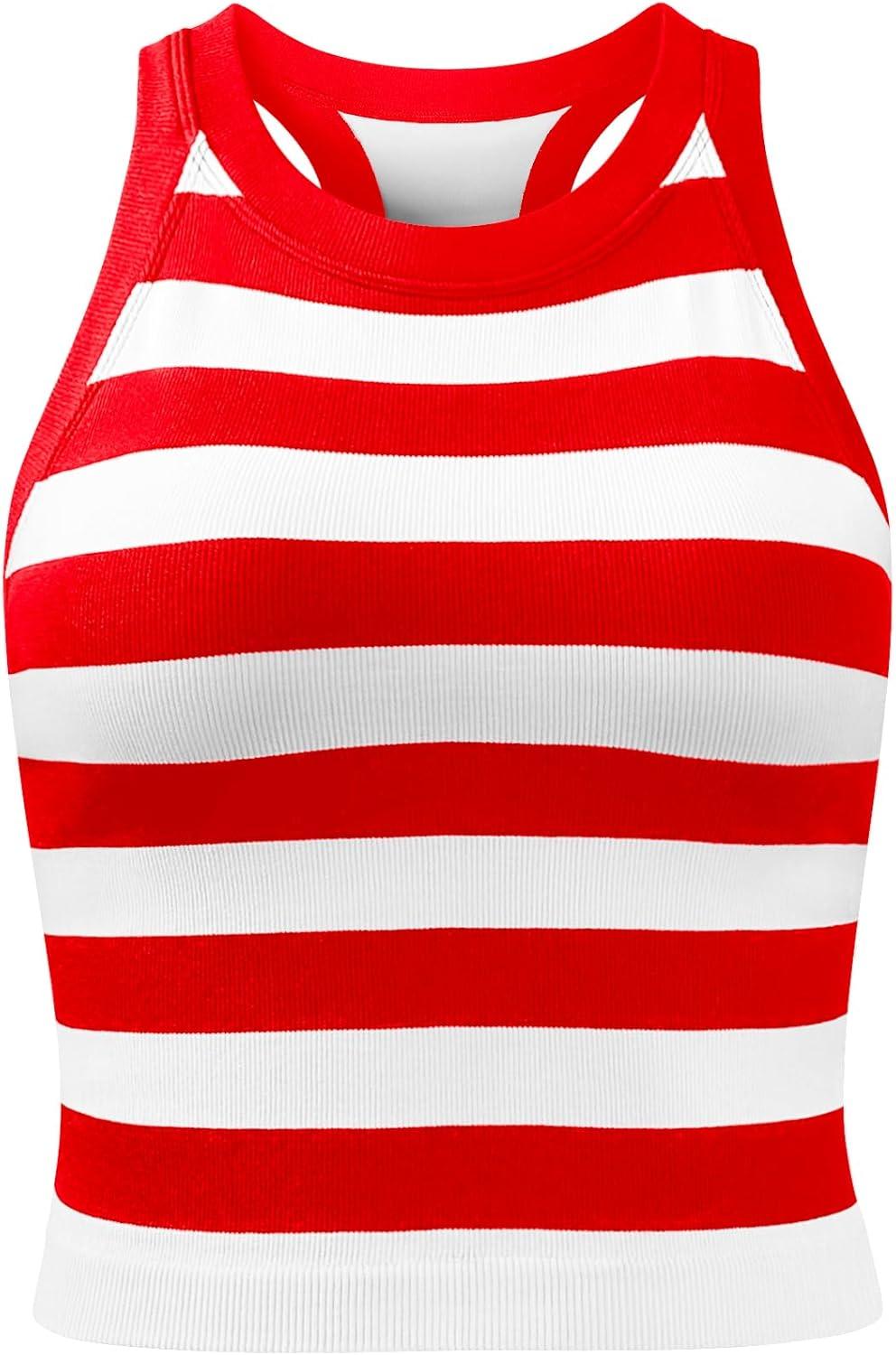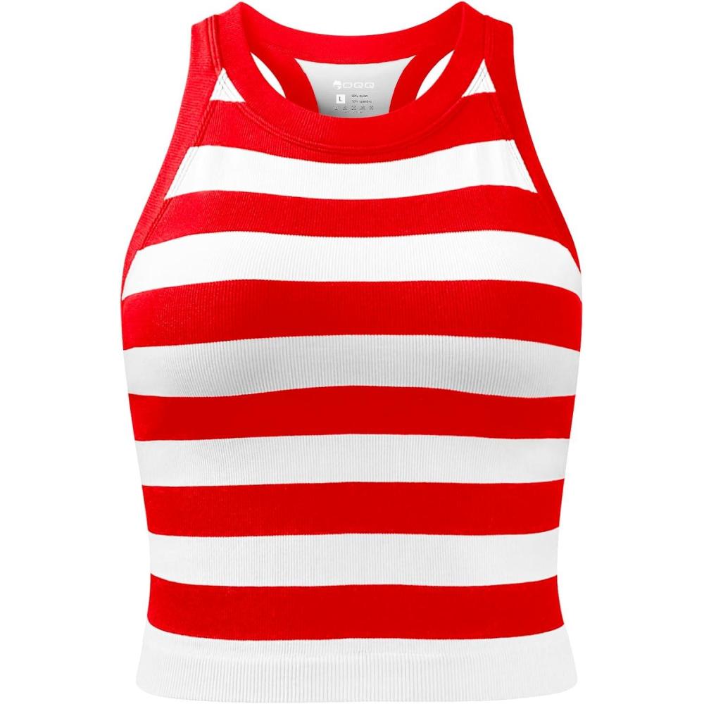 OQQ Womens Cerw Neck Sports Bra Workout Crop Striped Tank Tops Padded with Medium Support(Red)
