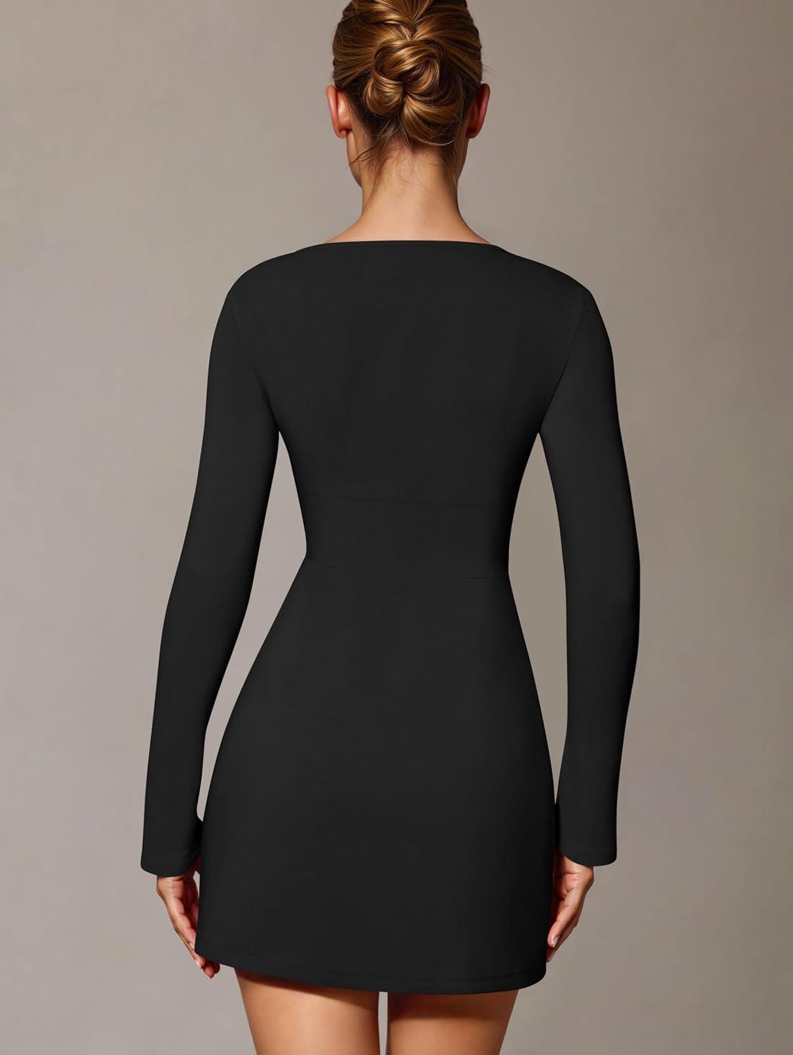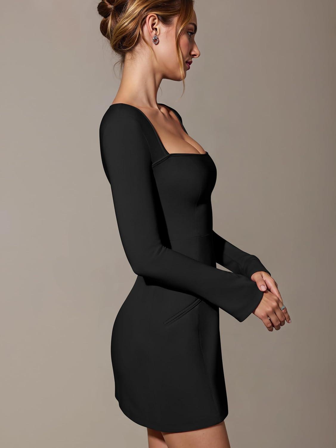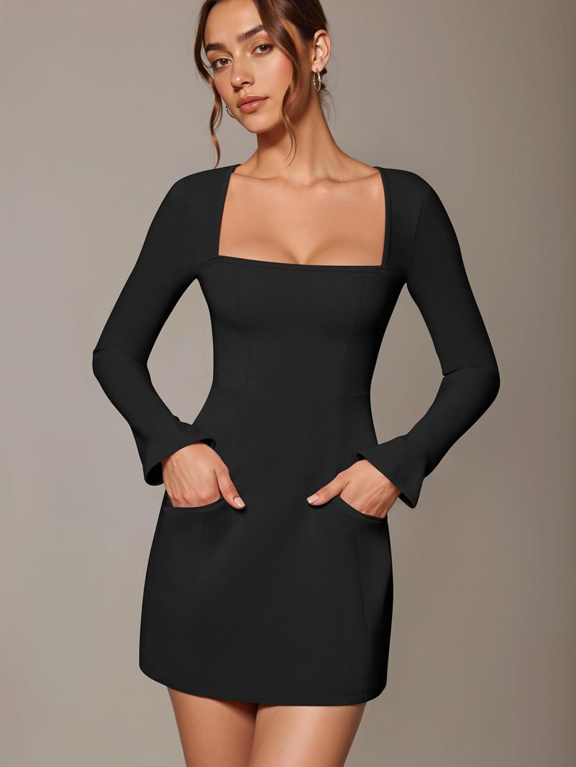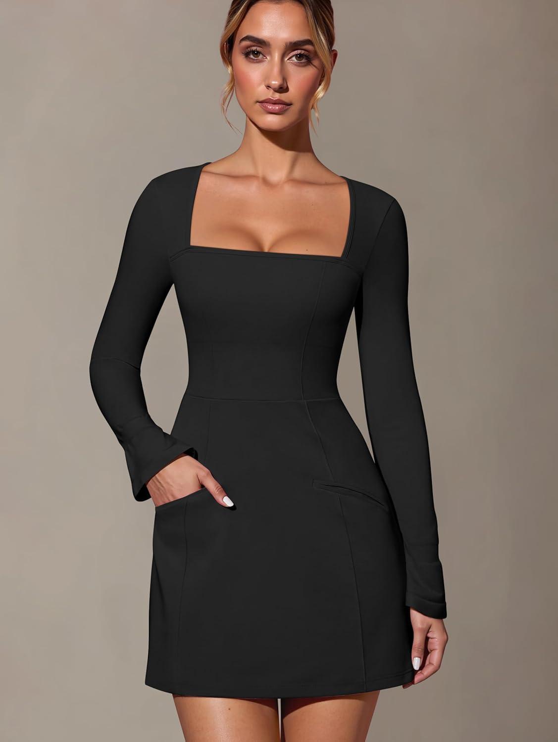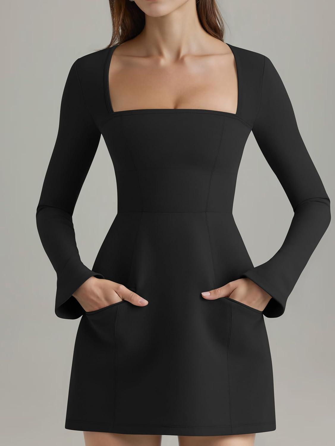 OQQ Women’s Club Dresses Squart Neck Long-Sleeve A-Line Mini Dress with Pockets(Black)