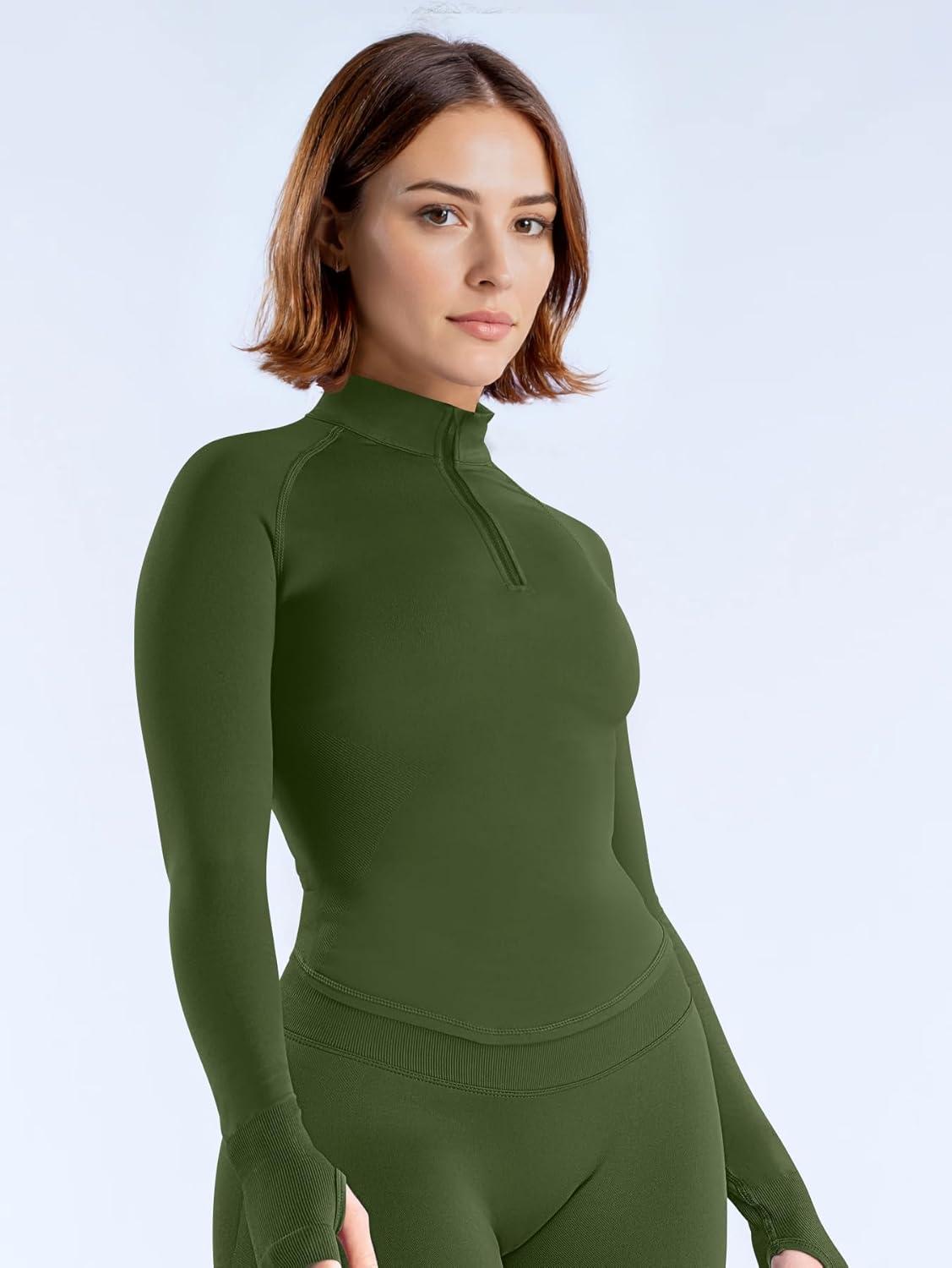 OQQ Workout Shirts Women Long Sleeve Yoga Tops Impact Half Zippy Tunics Running Shirts(Armygreen)